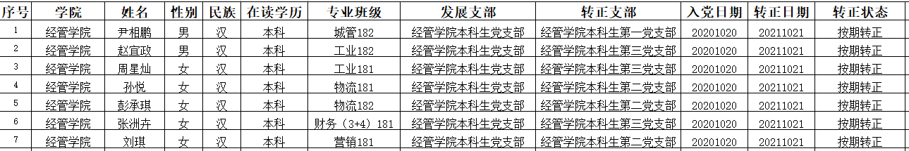 根据《中国共产党章程》和《中国共产党发展党员工作细则》及学校党委《关于发展学生党员工作的意见》(青科大党字〔2014〕77号)文件要求,经管学院本科生第一、第二、第三党支部于2021年10月21日召开预备党员转正大会讨论尹相鹏等7位同志的转正问题,同意以上同志按期转为中共正式党员,现将该7名同志情况予以公示。公示期为2021年10月21日至2021年10月28日。如有异议,请于公示期内到经管学院党委反映。