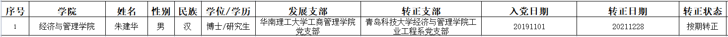 根据《中国共产党章程》《中国共产党发展党员工作细则》和学校党委《关于发展学生(教工)党员工作的意见》(青科大党字〔2014〕77号)等文件要求,经管学院工业工程系党支部于2021年12月28日召开预备党员转正大会讨论朱建华同志的转正问题,同意其按期转为中共正式党员,现将朱建华同志情况予以公示。公示期为2021年12月28日至2022年1月5日。如有异议,请于公示期内到经管学院党委反映。