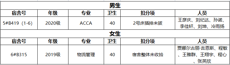 卫生检查结果及扣分细则请见附件,请各年级对照问题监督好不合格宿舍的整改。