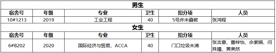 卫生检查结果及扣分细则请见附件,请各年级对照问题监督好不合格宿舍的整改。