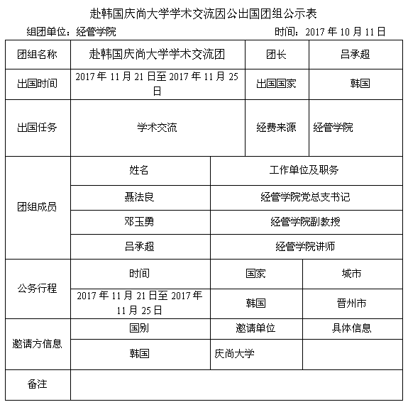 根据因公临时出国公开公示的有关规定,现将聂法良、邓玉勇、吕承超因公出国团组相关内容和参团人员名单予以公示。公示时间为2017年10月11日至2017年10月15日(5个工作日)。如有不同意见,请在公示期内,向经管学院单位(电话:88957399)反映。