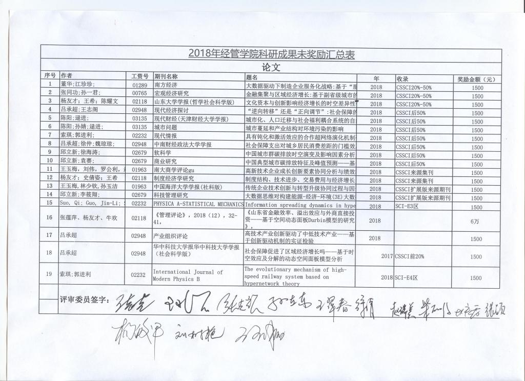 经过学术委员会审核,经济与管理学院2018年度科研奖励公示如下图: